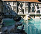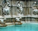 La prima fontana pubblica della città venne accolta con esultanza dalla cittadinanza quando venne inaugurata nel 1346. Dalla gioia spontanea procurata dallo sgorgare dell'acqua nella piazza pubblica ne derivò l'appellativo di "Gaia". Per alimentarla era stata costruita un'imponente opera idraulica, costituita da una galleria lunga circa trenta chilometri e da un "bottino maestro", potenziato nel corso del XV secolo da Francesco di Giorgio. La fonte, nella forma attuale, venne decorata da una serie di rilievi scultorei commissionati nel 1409 a Jacopo della Quercia e completati dieci anni dopo, nel 1419. I rilievi originari, molto danneggiati, si trovano oggi nel Museo di Santa Maria della Scala, dopo essere stati esposti nel Palazzo Pubblico. Nel 1868 erano stati infatti sostituiti da copie di Tito Sarrocchi. In quella stessa occasione venne anche spostata in posizione più centrale nella piazza e fu recintata da una cancellata. La fonte ha un bacino rettangolare aperto sul lato verso il Palazzo Pubblico, con una transenna sugli altri tre lati che degrada assecondando la pendenza della piazza. I due lati corti recano i bassorilievi con la Creazione di Adamo e la Cacciata dei progenitori e, sui pilastri anteriori le due statue a tutto tondo con Rea Silvia e Acca Larenzia, mentre in quello più lungo, i rilievi con al centro la Madonna col Bambino in trono circondata dalle Virtù e Angeli. L'impianto dela vasca e i temi della decorazione, dai temi legati all'etica e alla religione, ossequiano la tradizione consueta, mentre le caratteristiche formali dei singoli rilievi sono molto innovatile, con una libertà compositiva e una vitalità inedita. Le figure affondano e riemergono dal profilo ovale, con effetti di moto circolare, e nelle due statue a tutto tondo le figure seguono un incedere serpentino, equilibrando con la testa la curva del fianco.