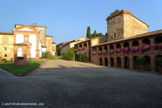 Interessante è pure l’accesso alla fattoria, una grande porta in mattoni la cui volta è divisa in due parti con raggiature differenti, che fanno pensare a due fasi di costruzione differenti. Di sicuro, però l’aspetto più stupefacente è la piazza della fattoria, su cui si affacciano la villa padronale (1750 circa), la chiesa cinquecentesca, e, soprattutto, due edifici a squadra presentanti un doppio loggiato con archi policentrici alternati a lesene, con chiari riferimenti alle ville senesi cinquecentesche dell’architetto Baldassarre Peruzzi. Al centro della piazza è, poi, presente un’aiuola triangolare con un pozzo in mattoni.