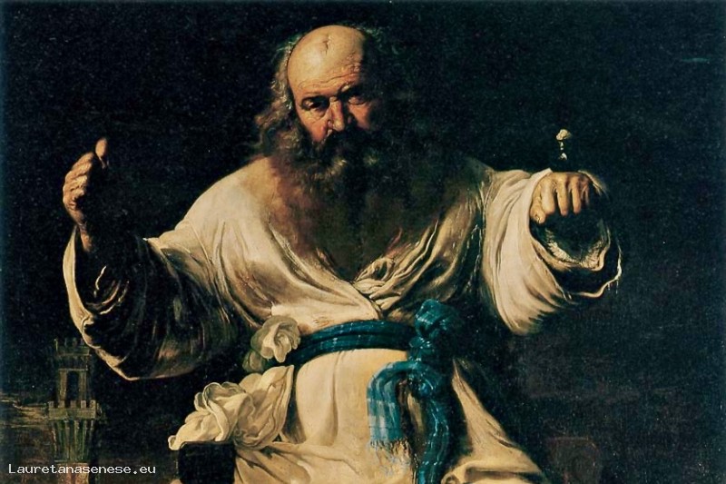 Il vecchio ciarlatano siede sopra un palco di legno attorniato dagli strumenti del proprio mestiere, boccette e ampolle di vetro contenenti pozioni dalle improbabili virtù terapeutiche. La visione dal basso sembra accentuare l’imponenza dell’ambiguo personaggio la cui corporatura viene amplificata dal sovrapporsi di innumerevoli strati di panni. L’esibizione del misterioso guaritore si svolge dentro le mura della città di Siena, come indica il profilo della torre del Mangia che si intravede nello sfondo, sulla sinistra del quadro. La folta barba da novello filosofo, la sguardo acuto, penetrante e la perentorietà dei gesti suscitano il timoroso stupore della folla che si raccoglie ai piedi del palco; non tutti sembrano comunque subire l’influenza dell’arcano personaggio: fra gli astanti sbigottiti trova posto anche lo scettico che annusa diffidente il contenuto di una piccola ampolla.