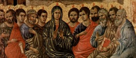 "La Pentecoste" è un dipinto autografo di Duccio di Buoninsegna appartenente al coronamento (verso) della Maestà del Duomo di Siena, realizzato con tecnica a tempera su tavola nel 1308-11, misura 37,5 x 42,5 cm. ed è custodito nel Museo dell'Opera del Duomo di Siena. La Vergine si evidenzia con il suo manto di stampo prettamente bizantino, fitto di lumeggiature dorate, nella folta schiera di apostoli le cui curve prospettiche seguono armonicamente la struttura compositiva dell'ambiente.