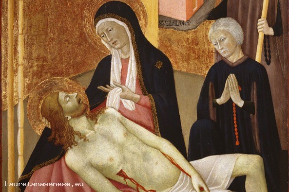 La tavola si caratterizza per il soggetto e l’iconografia decisamente insoliti che fanno del dipinto una sorta di ex voto: il corpo pallido ed esanime del Cristo è disteso sulle ginocchia della Vergine la quale, con gesto dolente, piange la passione e morte del Figlio al cui martirio fanno allusione la grande croce, il flagello appeso al chiodo, la lancia e la canna con la spugna con la quale i soldati romani diedero dell’aceto al Cristo morente. Inginocchiato accanto alla Vergine, le mani giunte in segno di preghiera, sta il committente dell’opera cui rimandano i due stemmi dipinti alla base della tavola, la cui individuazione ha permesso di riconoscere nell’anziano gentiluomo la figura di Peter Volckammer, ricco cittadino di Norimberga giunto in Siena al seguito dell’imperatore Sigismondo e qui deceduto il 5 settembre 1432. Dietro costui è San Sinibaldo che, in qualità di santo protettore della città germanica, tiene in mano un modellino simbolico di Norimberga. Inginocchiato accanto alla Vergine, le mani giunte in segno di preghiera, sta il committente dell’opera cui rimandano i due stemmi dipinti alla base della tavola, la cui individuazione ha permesso di riconoscere nell’anziano gentiluomo la figura di Peter Volckammer, ricco cittadino di Norimberga giunto in Siena al seguito dell’imperatore Sigismondo e qui deceduto il 5 settembre 1432. Dietro costui è San Sinibaldo che, in qualità di santo protettore della città germanica, tiene in mano un modellino simbolico di Norimberga. Il dipinto venne probabilmente eseguito poco dopo la morte del ricco personaggio, il cui corpo trovò sepoltura nel duomo senese: i due cimieri dello stemma dei Volckammer sono infatti privi della corona dorata di cui la famiglia ebbe diritto di fregiare la propria insegna a partire dal novembre del 1433.La tavola è stata riconosciuta dalla critica come una fra le opere più antiche dell’artista senese noto come ‘Maestro dell’Osservanza’. L’espressione assorta, vagamente imbambolata degli sguardi, il disegno netto dei profili e la predilezione per una pittura dai toni smaltati sembrano preludere alle soluzioni di Sano di Pietro della cui attività, secondo alcuni studiosi, i dipinti afferenti al gruppo ‘Maestro dell’Osservanza’ costituirebbero addirittura la più antica manifestazione.