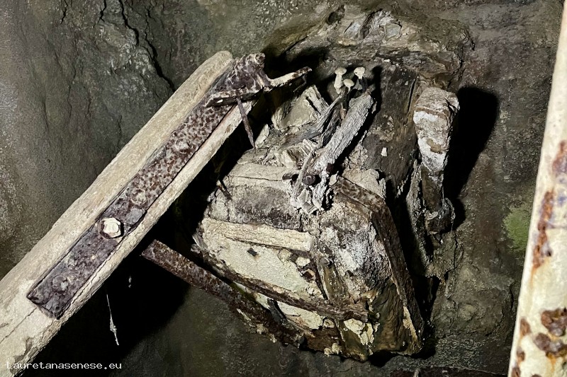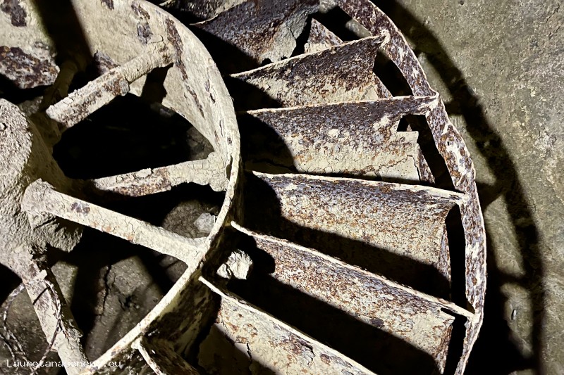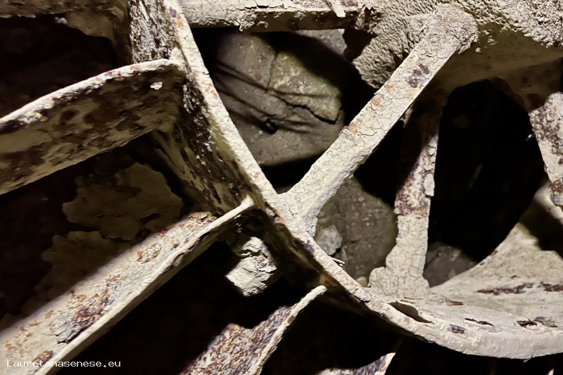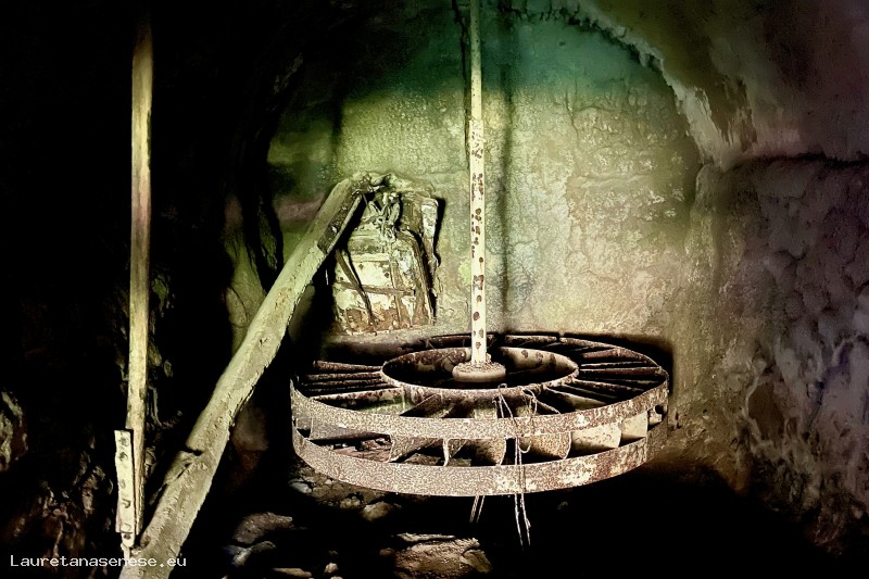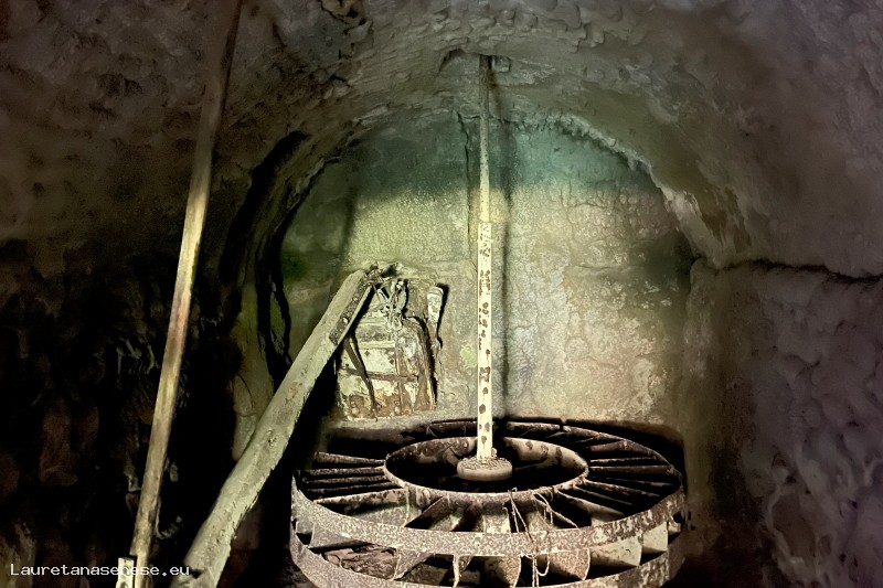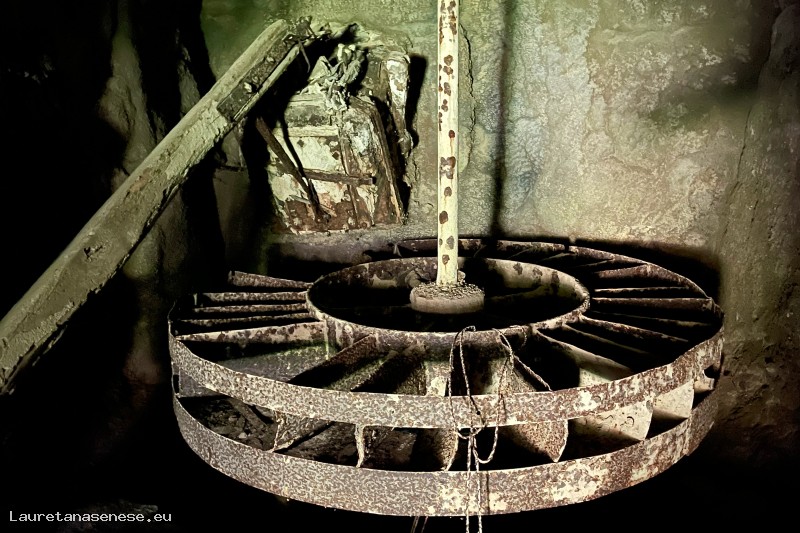 Un'altra caratteristica che si nota visitando i resti di questo Mulino, è costituita da una ruota ad asse orizzontale nel carcerario, al posto del classico ritrecine presente in tutti gli altri Mulini. Non sappiamo se e quando è avvenuta la trasformazione della struttura di funzionamento, anche se la ruota in ferro ancora esistente appare una realizzazione relativamente recente.