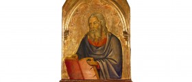 This table constituted the cusp of a polyptych that Andrea di Bartolo made for the Cathedral of Tuscania towards the end of the third decade of the fifteenth century. The generic nature of the attributes that accompany the figure makes it difficult to identify the holy personage who, pen and inkwell in hand, must certainly have represented one of the four Evangelists intent on writing the Gospel texts: the large cloaks that surround the bodies represent the rest that particular type of clothing codified by the iconographic tradition regarding the representation of biblical characters. The intense concentration of expressions, typical of the people engaged in the effort of mental elaboration, is as underlined by the dense network of wrinkles that runs through the faces of the character, whose old age seems however contradicted by the robust plasticism of the body that rises under the folds of the abundant drapery: this particular interpretation of physical nature refers directly to the pictorial ways of Taddeo di Bartolo, whom Andrea will show that he approaches in the later period of his career.