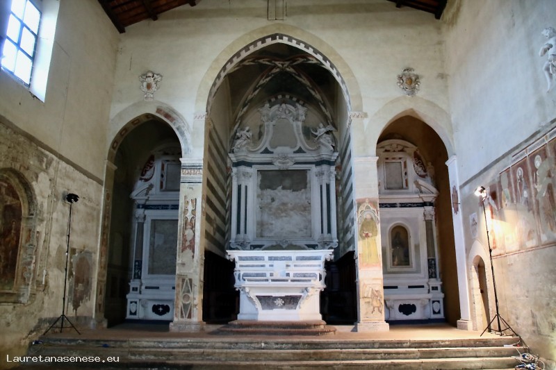 Oltre alla ricchezza di affreschi ancora da riscoprire in questa chiesa e alle tante opere trasferite a Palazzo Corboli, va ricordata la bellissima pala d’altare del 1522, in ceramica policroma, opera di Luca Della Robbia. Da sottolineare che questa chiesa è stata a lungo legata alla famiglia Tolomei, i cui stemmi sono disseminati numerosi sia al suo interno che all'estreno.