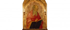 This table constituted the cusp of a polyptych that Andrea di Bartolo made for the Cathedral of Tuscania towards the end of the third decade of the fifteenth century. The generality of the attributes that accompany the figure makes it difficult to identify the holy personage who, pen and inkwell in his hand, certainly had to depict one of the four Evangelists intent on writing the Gospel texts: the large cloaks that surround the bodies represent the rest that particular type of clothing codified by the iconographic tradition regarding the representation of biblical characters. The intense concentration of expressions, typical of the people engaged in the effort of mental elaboration, is as underlined by the dense network of wrinkles that runs through the faces of the character, whose old age seems however contradicted by the robust plasticism of the body that rises under the folds of the abundant drapery: this particular interpretation of physical nature refers directly to the pictorial ways of Taddeo di Bartolo, whom Andrea will show that he approaches in the later period of his career.