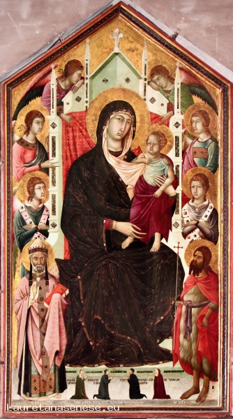 La Maestà dipinta, forse all'inizio del XIV secolo, da Segna di Bonaventura come attesta l'iscrizione alla base del dipinto che ricorda anche i nomi dei committenti raffigurati in basso, e forse derivante da quella dipinta da Duccio nel Palazzo Pubblico di Siena nel 1302.