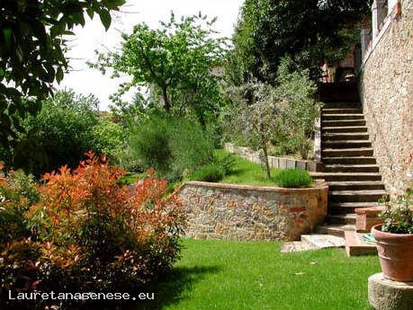 Davanti alla casa vacanze si trova un ampio e panoramico giardino su più livelli, ombreggiato da piante di alto fusto ed attrezzato con mobili da esterno e barbecue.